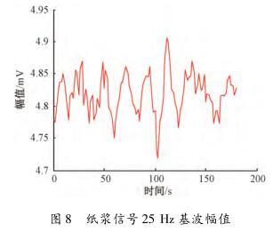 在頻域中對(duì)紙漿信號(hào)觀察時(shí)發(fā)現(xiàn),紙漿信號(hào)的漿液噪聲頻帶在零頻率點(diǎn)附近,距離流量信號(hào)基波頻率點(diǎn)較遠(yuǎn),對(duì)基波幅值和各奇次諧波幅值基本沒(méi)有影響,紙漿信號(hào)在頻域中的圖形如圖7所示。選擇一組采集的紙漿信號(hào),把其等分成數(shù)段,利用MATLAB計(jì)算每段數(shù)據(jù)在基波處的幅值并提取保存在一個(gè)數(shù)組中,使用繪圖工具畫出來(lái),如圖8所示。可見(jiàn),基波幅值在4.7~4.95mV變化,波動(dòng)較小。因此,提取到的與流量相關(guān)的感應(yīng)電動(dòng)勢(shì)信號(hào)幅值會(huì)比較穩(wěn)定。