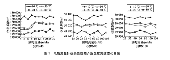 由圖1可得:( 1)隨著介質(zhì)溫度的升高,管道污水處理進(jìn)出水口流量計(jì)的儀表系數(shù)均呈逐漸降低的趨勢(shì)。其中20℃和50℃的儀表系數(shù)基本相同,10℃和80 0C的儀表系數(shù)與20℃時(shí)偏離較大。(2)溫度對(duì)管道污水處理進(jìn)出水口流量計(jì)的儀表系數(shù)在高溫以及低溫處影響明顯,以D N40管道污水處理進(jìn)出水口流量計(jì)為例,儀表系數(shù)本次實(shí)驗(yàn)高低溫處*大變化量約為0. 7% o ( 3)在管道污水處理進(jìn)出水口流量計(jì)相應(yīng)的流量范圍內(nèi),在同一溫度下,隨著介質(zhì)流速的變化,管道污水處理進(jìn)出水口流量計(jì)的儀表系數(shù)在個(gè)別點(diǎn)出現(xiàn)略微浮動(dòng),但整體變化不超過(guò)1 0. 2 %。