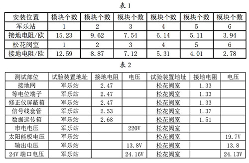 接地網(wǎng)的安裝與連接:接地網(wǎng)是整個(gè)加油站柴油流量計(jì)防雷試驗(yàn)比較關(guān)鍵的一個(gè)內(nèi)容,能不能準(zhǔn)確的論證試驗(yàn)的有效性,必須保證接地網(wǎng)達(dá)到標(biāo)準(zhǔn)的接地電阻,通過對(duì)實(shí)地地電阻率的測(cè)試,初步選擇6個(gè)接地模塊埋設(shè)并配用降阻劑使用,邊安裝邊測(cè)試直到達(dá)到標(biāo)準(zhǔn)值后才引入等電位箱。在軍樂站和松花閥室安裝模塊并測(cè)試數(shù)據(jù)見表1。