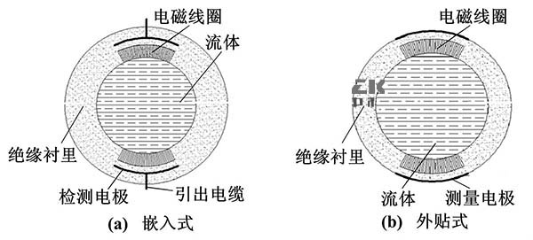 電極與被測流體通過絕緣管形成檢測電容,通過此電容來藕合流量信號。其主要的結(jié)構(gòu)形式按照電極的安裝位置可以分為兩種:電極嵌人測量管的絕緣襯里內(nèi)部(嵌人式)、電極貼在測量管外部(外貼式)。嵌入式結(jié)構(gòu)與普通一寸管污水流量計結(jié)構(gòu)相似,而外貼式大多是通過陶瓷表面金屬化技術(shù)將電極貼在測量管外。