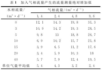 利用清水中渦輪的刻度方程計(jì)算加入不同氣體流量后渦輪響應(yīng)頻率所對應(yīng)的流量,即為加入氣體后的測量流量,再用所得測量流量減去配比的標(biāo)準(zhǔn)水流量,得到氣相加入后測量的絕對增加值,即加入氣相流量產(chǎn)生的測量誤差(見表1)。計(jì)算結(jié)果表明,加入氣體流量后,渦輪的測量流量明顯增加,尤其是液相流量較低時(shí),增加的測量流量更高,氣體對流量測量產(chǎn)生了較大的測量誤差。低氣量下,平均1m3/d的氣量產(chǎn)生的測量誤差大約相當(dāng)于5m3/d(絕對增加值)。