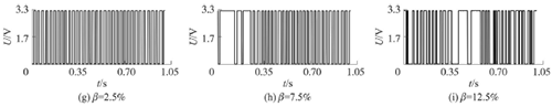 試驗(yàn)發(fā)現(xiàn),氣相的加入對過熱蒸汽流量計(jì)測量的影響顯著,譜分析和脈沖計(jì)數(shù)兩種方法隨著氣相注入的增加其表現(xiàn)也不同。圖4反映了水流量12m3/h時(shí),注入不同氣含率β時(shí)A點(diǎn)的模擬信號,如圖4(a~c)所示;經(jīng)譜分析后得到的頻率值,如圖4(d~f)所示;用脈沖計(jì)數(shù)方法得到的脈沖信號,如圖4(g~i)所示。圖4顯示,當(dāng)注入氣量不大時(shí),對過熱蒸汽流量計(jì)的影響不大,無論是譜分析結(jié)果還是脈沖計(jì)數(shù)得到的結(jié)果都比較好。當(dāng)注入的氣量進(jìn)一步增加時(shí),渦街原始信號強(qiáng)度和穩(wěn)定性逐漸變差,渦街頻率信號會(huì)被干擾信號所淹沒,反映到譜分析圖是,渦街頻率的譜能量減小,干擾信號的譜能量加強(qiáng);對于脈沖信號,會(huì)因?yàn)橐恍┬郎u信號減弱,形成脈沖缺失現(xiàn)象,而不能真實(shí)地反映渦街產(chǎn)生的頻率。