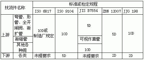 為獲得正常測(cè)量精確度,電磁流量傳感器上游也要有一定長(zhǎng)度直管段,但其長(zhǎng)度與大部分其它流量?jī)x表相比要求較低。90°彎管、T形管、同心異徑管、全開(kāi)閘閥后通常認(rèn)為只要離電極中心線(不是傳感器進(jìn)口端連接面)5倍直徑(5D)長(zhǎng)度的直管段,不同開(kāi)度的閥則需10D;下游直管段為(2~3)D或無(wú)要求;但要防止蝶閥閥片伸入到傳感器測(cè)量管內(nèi)。各標(biāo)準(zhǔn)或檢定規(guī)程所提出上下游直管段長(zhǎng)度亦不一致,匯集如表1所示,要求比通常要求高,這是由于為保證達(dá)到當(dāng)前0.5級(jí)精度儀表的要求。表1