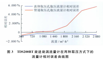從以上數(shù)據(jù)表和曲線圖中可以看出:天燃?xì)饬髁坑?jì)型號一定的情況下,用表體取壓孔取壓方式檢定流量計(jì)時(shí)流量計(jì)的線性度較好,用管道取壓孔取壓方式檢定流量計(jì)時(shí)流量計(jì)的線性度較差;流量測點(diǎn)相同的情況下,表體取壓孔取壓檢定方式的流量計(jì)誤差較小,管道取壓孔取壓檢定方式的流量計(jì)誤差較大;兩種取壓方式引起的誤差隨著流量的增大而逐漸增大,在流量為2 900m3/h時(shí)兩者相差近6.2%,遠(yuǎn)遠(yuǎn)超出了流量計(jì)的準(zhǔn)確度等級。所以,在天燃?xì)饬髁坑?jì)的檢定過程中,應(yīng)避免在流量計(jì)表體取壓孔以外的地方取壓進(jìn)行檢定。