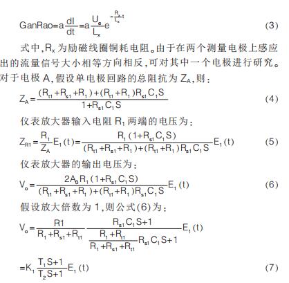 提出在硬件電路上加入模擬開關(guān), 干擾尖峰到來時(shí)斷開模擬開關(guān)避免干擾進(jìn)入后級電路,尖峰過去重新打開模擬開關(guān);K.Saito 等提出漂移校正法,先以高勵(lì)磁頻率進(jìn)行勵(lì)磁,在勵(lì)磁過程中插入低勵(lì)磁頻率提取用于漂移校正的非固定微分噪聲分量,但在插入的低勵(lì)磁頻率段漿液噪聲較大且很難將漿液噪聲與流量信號分離,此時(shí)的校正因子非單純的非固定噪聲分量,改進(jìn)措施是長時(shí)間取平均值得到穩(wěn)定因子。 傳統(tǒng)方法是同步采樣保持法,即在磁場穩(wěn)定階段采樣。 其他消除干擾的方法有設(shè)置干擾補(bǔ)償機(jī)構(gòu)、控制勵(lì)磁電流變化率減小干擾幅值、矩形波代替梯形波、希爾伯特黃變換結(jié)合傅里葉變換和程控增益技術(shù)等。經(jīng)上述對現(xiàn)有的文獻(xiàn)分析與總結(jié)可知, 當(dāng)前消除微分噪聲主要從信號處理方面入手,并未對影響噪聲的因素加以研究。 本文建立電極測量回路等效模型,給出仿真模型搭建、參數(shù)取值和仿真結(jié)果分析。