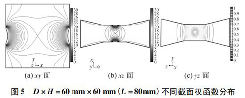 4) 圖 3( c) 、圖 4( c) 的 yz 面權(quán)函數(shù)分布表明,D = 90 mm時(shí)的權(quán)函數(shù)等勢線間距略大于 D = 60 mm 時(shí)的權(quán)函數(shù)等勢線間距,權(quán)函數(shù)變化梯度較小,且中心區(qū)域的權(quán)函數(shù)等勢線逐漸變?yōu)橹本€,因此 D = 90 mm 的權(quán)函數(shù)分布更均勻一些,但是兩者區(qū)別很小,即寬度改變對(duì) yz 面權(quán)函數(shù)分布影響很小。圖 4( c) 、圖 5( c) 的 yz 面權(quán)函數(shù)分布表明,H = 30 mm時(shí)的權(quán)函數(shù)等勢線間距較大,且中心區(qū)域的權(quán)函數(shù)等勢線逐漸變?yōu)橹本€,因此 H = 30 mm 的權(quán)函數(shù)分布更加均勻;