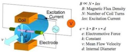 使用一體式電磁流量計(jì)測量的液體流量必須導(dǎo)電是非常重要的。法拉*定律表明,信號電壓(E)取決于平均液體速度(V),導(dǎo)體的長度(D)和磁場強(qiáng)度(B)。因此,將在管的橫截面中建立磁場。