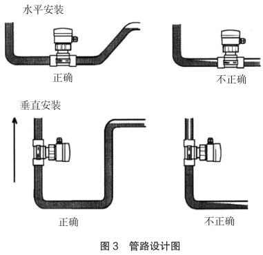 現(xiàn)場安裝時應(yīng)注意遠(yuǎn)離可能對其產(chǎn)生干擾的大型設(shè)備,防止長期的熱輻射和其他如磁場直射等環(huán)境影響。為確保高測量精度和較好的零點穩(wěn)定性,進(jìn)行校正前,高壓電磁流量計應(yīng)裝入工藝介質(zhì)中至少 24 小時電極鈍化。安裝的管路設(shè)計應(yīng)確保管道始終充滿流體,防止測量誤差,管路設(shè)計圖見圖 3。