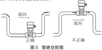 測量流向取決于高壓電磁流量計的安裝方位,將高壓電磁流量計在接頭上旋轉(zhuǎn) 180 度即可反向。正流向時,高壓電磁流量計的突耳應(yīng)在上游方向。流量顯示總是正的,而累加器可以根據(jù)流向增加或者減少。安裝中確認(rèn)管路設(shè)計不允許在介質(zhì)中產(chǎn)生氣泡或空腔,否則將引起測量誤差(見圖 5)。