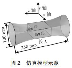 使用 Pro /E 軟件建立三維幾何模型,導(dǎo)入 COMSOL 軟件進行有限元求解。仿真模型如圖 2 所示,電極連線為x 軸,連線中點為坐標原點,流體運動方向為 z 軸,傳感器管道口徑為 DN100,總長250 mm。異徑管部分初始結(jié)構(gòu)尺寸 L = 80 mm,D = 80 mm,H = 40 mm,圓形電極半徑為17 mm,伸出絕緣襯里的*大距離為 1. 5 mm。