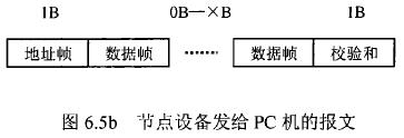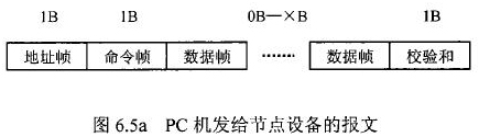 在飲用水流量計等節(jié)點設備和C機通信的過程中,由地址幀、命令幀、數(shù)據(jù)幀、校驗和可組成各種功能不同的報文。由于采用主從工作方式來實現(xiàn)通信,飲用水流量計等節(jié)點設備僅能接收并執(zhí)行PC機發(fā)送來的控制命令,而不能發(fā)送命令給PC機。因此,由PC機發(fā)往流量計等節(jié)點設備的報文一般包括一個地址幀,一個命令幀,若干個數(shù)據(jù)幀和一個校驗和,其報文格式圖.6a5所示;而由流量計等節(jié)點設備發(fā)往PC機的報文一般包括一個地址幀,若干個數(shù)據(jù)幀和一個校驗和,其報文格式如圖6.5b所示。