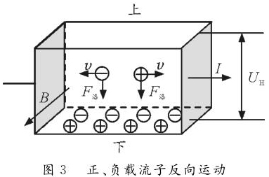 反之,如圖2所示,若載流子帶負(fù)電荷,則載流子在洛倫茲力作用下會向下偏轉(zhuǎn),導(dǎo)體下表面積累負(fù)電荷。同時(shí),上表面失去負(fù)電荷而帶上正電,從而使上表面電勢高于下表面。