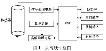 高頻勵(lì)磁煤焦油流量計(jì)由傳感器、高頻勵(lì)磁電路、信號(hào)處理電路等組成,其中高頻勵(lì)磁電路決定著傳感器磁場(chǎng)的強(qiáng)弱,勵(lì)磁電路的穩(wěn)定性以及精確性決定著系統(tǒng)檢測(cè)的準(zhǔn)確性以及穩(wěn)定性。DSP 系統(tǒng)控制勵(lì)磁電路激勵(lì)傳感器線圈,當(dāng)線圈中有導(dǎo)電液體流過(guò)時(shí),其切割磁感線并在傳感器兩端的線圈上產(chǎn)生感應(yīng)電動(dòng)勢(shì),利用信號(hào)檢測(cè)電路監(jiān)測(cè)感應(yīng)電動(dòng)勢(shì)的大小,*后根據(jù)相應(yīng)關(guān)系計(jì)算出液體的流量,系統(tǒng)硬件框圖如圖 1 所示。