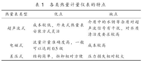 目前供熱行業(yè)內(nèi)使用的熱量計量儀表按工作原理主要分為超聲波式、 電磁式、 差壓式, 其特點見表 1 。 熱量計量儀表按結(jié)構(gòu)可分為一體式和分體式, 一體式熱量表將一支入口或出口溫度傳感器嵌入到流量傳感器管道中, 并配有專門的計算器進行熱量計算; 分體式熱量表采用單獨的流量傳感器, 包括超聲波流量計、 電磁流量計、 差壓流量計、飽和鹽水流量計等, 溫度測量采用單獨的鉑電阻溫度計或溫度變送器測量供回水管道溫度, 再配備熱量積算儀進行溫度和流量信號采集得到熱量值。