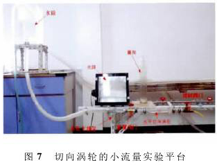 為了驗證仿真的準(zhǔn)確性,通過室內(nèi)實驗對其驗證。切向渦輪采用可視化研究平臺,整個渦輪的結(jié)構(gòu)都采用亞克力板雕刻組裝而成。如圖7所示,水箱主要提供穩(wěn)定水壓,水平切向渦輪做成開口系統(tǒng)并放置在實驗支撐架上,前置閥門可控制水流,在需要更換切向渦輪的零件時可關(guān)閉,控制閥門主要是控制流經(jīng)切向渦輪的流量,流量測量仍采用傳統(tǒng)可靠的容積時間法。實驗時以染色劑作為示蹤劑,以觀察流場的分布情況。