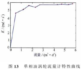 可以看出,渦輪啟動后*先進入一個非線性段,在非線性相應(yīng)段,K值隨著流量增加而增大;當(dāng)流量比較大(單相水超過0.5m3/d,單相油超過1m3/d)時,渦輪進入線性段,在線性響應(yīng)段,K值達到峰值,有相對較小的波動。