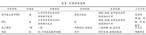 乙醇管道流量計要根據(jù)被測流體的溫度、壓力、速度以及含固顆粒的硬度、含量和粒徑大小來決定測量管內(nèi)襯的材質(zhì)。該濕法磷酸裝置中,乙醇管道流量計測量管襯里材質(zhì)的種類見表 2。