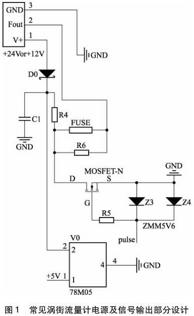 從圖1 中可以看到,供電電源 +24 V, +12 V均可,直流電源通過瓷片電容 C1 濾掉部分紋波,然后通過線性穩(wěn)壓芯片 78M05,得到 + 5 V 電壓,為后面的渦街蒸汽流量計信號處理電路供電,若要再得到 3. 3 V 電壓,通常會在 78M05 后再加一片線性穩(wěn)壓芯片 LM1117-3. 3,為了節(jié)約成本,供電電路沒有做 EMS 設(shè)計。同時,脈沖輸出部分,僅通過一個 MOS 管和兩個穩(wěn)壓管,也沒有 EMS 方面的設(shè)計考慮。