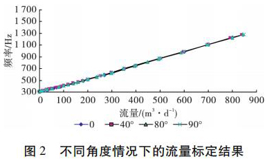 為了考察井眼斜度變化對(duì)硫酸銅流量計(jì)測量流量的影響,開展了非集流硫酸銅流量計(jì)在不同斜度情況下的流量測量模擬實(shí)驗(yàn)。模擬實(shí)驗(yàn)在大慶油田多相流實(shí)驗(yàn)室進(jìn)行,儀器外徑 38 mm,模擬井筒內(nèi)徑為 124 mm,實(shí)驗(yàn)介質(zhì)是水,傾斜角度分別為 0°、40°、80°和 90°( 水平) ,流量范圍為 5 ~ 850 m3 /d。實(shí)驗(yàn)結(jié)果表明,在儀器居中條件下,井眼斜度變化對(duì)硫酸銅流量計(jì)的儀表常數(shù)沒有影響,滿量程誤差不大于 4% ,因此可以應(yīng)用硫酸銅流量計(jì)進(jìn)行水平井注水剖面測量。不同角度情況下的實(shí)驗(yàn)結(jié)果如圖 2 所示。