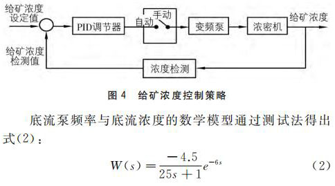 給礦濃度控制策略采用常規(guī)的PID調(diào)節(jié)器實(shí)現(xiàn),如圖4所示。在該控制系統(tǒng)中,給礦濃度設(shè)定值以及反饋的給礦濃度檢測值為PID調(diào)節(jié)器的輸 入,PID 調(diào)節(jié)器的輸出為變頻泵的頻率。該頻率可進(jìn)行自動(dòng)與手動(dòng)兩種控制模式。以變頻控制方式對濃密機(jī)的底流泵進(jìn)行精密轉(zhuǎn)速控制,即可控制濃密機(jī)排出的底流礦漿的濃度。