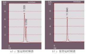 對振動采集器獲取的信號進行譜分析,超聲波污水流量計組運轉狀態(tài)下主要振動頻率為11.33Hz和12.38Hz,其中12.38Hz為液體流量計轉動頻率;停運時,12.38Hz的液體流量計轉頻消失,11.33Hz的外部激擾力依然存在。