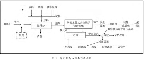 在有色金屬冶煉過程中,將原料、燃料和輔助材料根據(jù)熱平衡原理按一定比例進行配料,配料后的物料與空氣或高含氧的混合空氣在熔煉爐中進行氧化或還原反應(yīng),熔煉出有色金屬產(chǎn)品。同時,在熔煉過程中會產(chǎn)生大量的高溫?zé)煔猓?1200 ℃ 左右),高溫?zé)煔饨?jīng)過余熱鍋爐時,與余熱鍋爐水側(cè)的軟化水進行熱量交換,煙溫迅速降至 250℃ 以下,再經(jīng)收塵、制酸或脫硫裝置進一步收塵、降溫、凈化,*終達標(biāo)排放。余熱鍋爐水側(cè)的軟化水經(jīng)熱量交換后產(chǎn)生中壓飽和蒸汽(4 MPa 左右),送至余熱發(fā)電機組發(fā)電。具體的工藝流程如圖 1 所示。