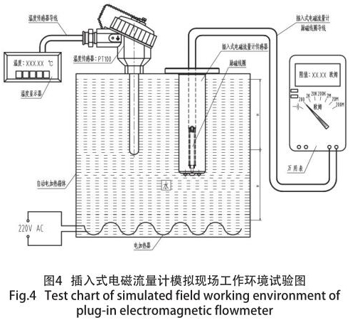 其原因是:勵(lì)磁線圈的阻值及匝數(shù)是按照常溫狀態(tài)下進(jìn)行設(shè)計(jì)的,而含有勵(lì)磁線圈的測(cè)水流量計(jì)經(jīng)常是高于常溫狀態(tài)下進(jìn)行安裝、使用(如:高爐回水、供熱管道等),勵(lì)磁線圈的阻值隨使用環(huán)境溫度的變化而變化,致使測(cè)水流量計(jì)測(cè)量時(shí)的準(zhǔn)確度大為降低,性能的不確定性大為增加,為了保證儀表的高準(zhǔn)確度和穩(wěn)定性,在不同的季節(jié)(主要是環(huán)境溫度和介質(zhì)溫度),經(jīng)過大量模擬現(xiàn)場(chǎng)實(shí)際情況的試驗(yàn),并結(jié)合轉(zhuǎn)換器的技術(shù)參數(shù)要求,得出一個(gè)完善的勵(lì)磁線圈各種技術(shù)參數(shù)。模擬現(xiàn)場(chǎng)試驗(yàn)裝置如圖 4 所示。