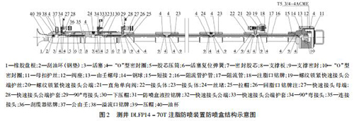 如圖 2 所示,DLFP14 - 70T 注脂防噴盒有 1 個注脂口、1 個回脂口、1 個防噴盒液控口、1 個刮纜器液控口及1 個溢流口,主體內(nèi)裝有 6 根阻流管。DLFP14 - 70T 注脂防噴盒采用 4 級密封: * 1 級密封采用注脂密封,撬裝注脂泵從注脂口注入高壓高粘度密封脂于 6 根阻流管與電纜間隙; * 2 級密封采用液壓密封,氣動液壓泵主加壓和手壓泵補(bǔ)加壓結(jié)合從防噴盒液控口注入液壓油,推動活塞擠壓膠芯壓筒; * 3 級密封采用液壓密封,手壓泵加壓從刮纜器液控口注入液壓油,推動活塞擠壓膠芯壓筒實現(xiàn)密封和刮油作用; * 4 級密封油杯、橡膠盤根和刮油環(huán)( 鋼 墊) 。DLFP14 - 70T 注脂防噴裝置配有液控上、下捕捉器、液控雙閘板防噴器和放噴組件,根據(jù)實際可以調(diào)整溢流量,實現(xiàn)零溢流密閉測井施工。 DLFP14 - 70T 注脂防噴裝置工作壓力 70 MPa,耐壓105 MPa。