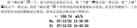 該記錄表示:*一條掉電記錄(No.1),停電時(shí)間為 07 年 12 月 22 日 13 點(diǎn) 35 分 05 秒,重新上電時(shí)間為 07 年 12 月 23 日 10 點(diǎn) 45 分 20 秒,掉電時(shí)的瞬時(shí)流量為 168.74m3/h,該次掉電時(shí)間長(zhǎng)度為 21 小時(shí) 10 分鐘。
