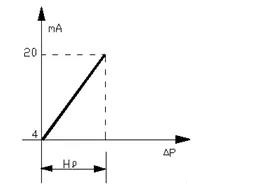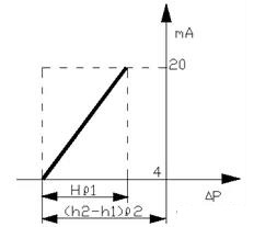 以電動差壓變送器為例,當(dāng)液位H為O時,差壓變送器輸出的信號應(yīng)為4 mA,當(dāng)液位H為*高液位時,差壓變送器輸出的信號應(yīng)為20 mA,這是一種比較理想狀態(tài)。從圖1可見,當(dāng)被測介質(zhì)的密度為ρ,容器中液體以上部分的氣相并不會凝結(jié)成冷凝液,這時作用于變送器正負壓室的差壓應(yīng)為:△Р= Hρ。其曲線如圖2所示: