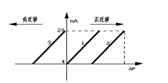 差壓變送器的零點遷移量分為正遷移與負遷移,在液位零點位置,當(dāng)正負壓室之間的壓差值P>0時,為正遷移;P<0時,為負遷移;P=0時,無遷移。差壓變送器正負遷移特性曲線表示如下,見圖3: