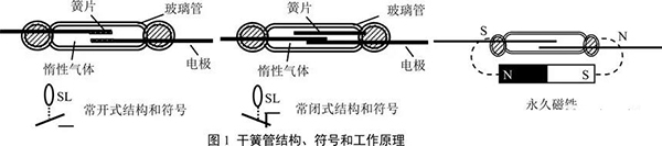 干簧管開關(guān):由一組或幾組導(dǎo)磁金屬簧片封裝在充有惰性氣體的玻璃管中組成的元件,每組簧片既能導(dǎo)磁又能導(dǎo)電,起開關(guān)電路和磁路的雙重作用,如圖1。對于常開型:當(dāng)干簧管在外加永久磁場或電磁場的作用時(shí),干簧管中的兩根簧片分別被磁化,在兩根簧片接近的地方產(chǎn)生異性磁極而吸引,兩根簧片相接觸使電路導(dǎo)通。反過來,當(dāng)磁場取消時(shí),簧片依靠本身的彈性力恢復(fù)原狀,兩簧片分離,電路斷開,這樣便完成了一個(gè)開關(guān)的作用。常閉型干簧管原理可自行分析。干簧開關(guān)有許多優(yōu)點(diǎn):由于接點(diǎn)密閉在充滿惰性氣體的玻璃管中,不易腐蝕、氧化和污染,接點(diǎn)免于維護(hù);接通或釋放的時(shí)間只有1~3毫秒,僅為電磁繼電器的1/5~1/10,可以作為速動(dòng)開關(guān)使用;由于接點(diǎn)部分使用了金、鐒、鈀合金鍍層,壽命長,開關(guān)約為106~107次。