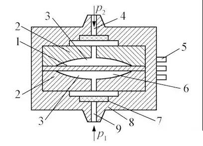 1—金屬膜片(動(dòng)極);2—凹玻璃圓盤;3—金屬鍍層(定極);4—低壓側(cè)導(dǎo)壓口;5—輸出端子;6—空腔;7—過(guò)濾器;8—殼體;9—高壓側(cè)導(dǎo)壓口