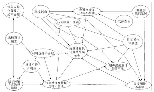 制藥廠污水流量計(jì)量系統(tǒng)計(jì)量的準(zhǔn)確性既與制藥廠污水流量計(jì)本體有關(guān),也和壓力、溫度測(cè)量?jī)x表、色譜分析儀以及流量計(jì)算機(jī)等設(shè)備的可靠性有直接關(guān)系。此外,在員工操作、環(huán)境影響、設(shè)計(jì)選型、設(shè)備安裝等方面也會(huì)一定程度影響制藥廠污水流量計(jì)量的準(zhǔn)確性,其影響因素復(fù)雜多樣。電磁計(jì)量系統(tǒng)計(jì)量準(zhǔn)確性影響因素關(guān)聯(lián)關(guān)系如圖2所示。在實(shí)際生產(chǎn)應(yīng)用中,對(duì)制藥廠污水流量計(jì)量準(zhǔn)確性造成較大影響的主要是噪音、液體計(jì)量雜質(zhì)、氣體組分分析以及壓力、溫度測(cè)量這四個(gè)方面。