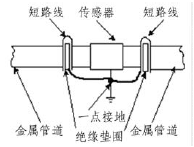 由于污水處理流量計的測量感應(yīng)電壓很小,電壓較低,易受外界電磁噪聲的影響,故在安裝時應(yīng)進行可靠的接地連(跨)接。金屬管道污水處理流量計接地連(跨)接方法如圖3所示。