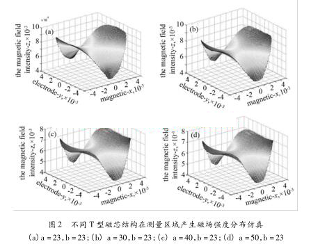 如圖2所示為不同T型磁芯結(jié)構(gòu)在井水流量計(jì)測(cè)量區(qū)域產(chǎn)生磁場(chǎng)強(qiáng)度分布仿真圖。由于篇幅原因,這里只顯示了k1/(k1 + k2)為1/2,b 為23°的仿真圖。圖2(a),(b),(c),(d)分別顯示的是a為23°,30°,40°,50°時(shí)井水流量計(jì)測(cè)量區(qū)域截面磁場(chǎng)仿真圖,從仿真圖中可以發(fā)現(xiàn)當(dāng)磁芯所占空間減小,勵(lì)磁線圈空間增大時(shí),流量計(jì)內(nèi)部測(cè)量區(qū)域中的磁場(chǎng)強(qiáng)度總體上有所增加。在仿真實(shí)驗(yàn)中,將所得的仿真數(shù)據(jù)保存,對(duì)其運(yùn)用磁場(chǎng)評(píng)價(jià)指標(biāo)進(jìn)行下一步的數(shù)據(jù)分析。